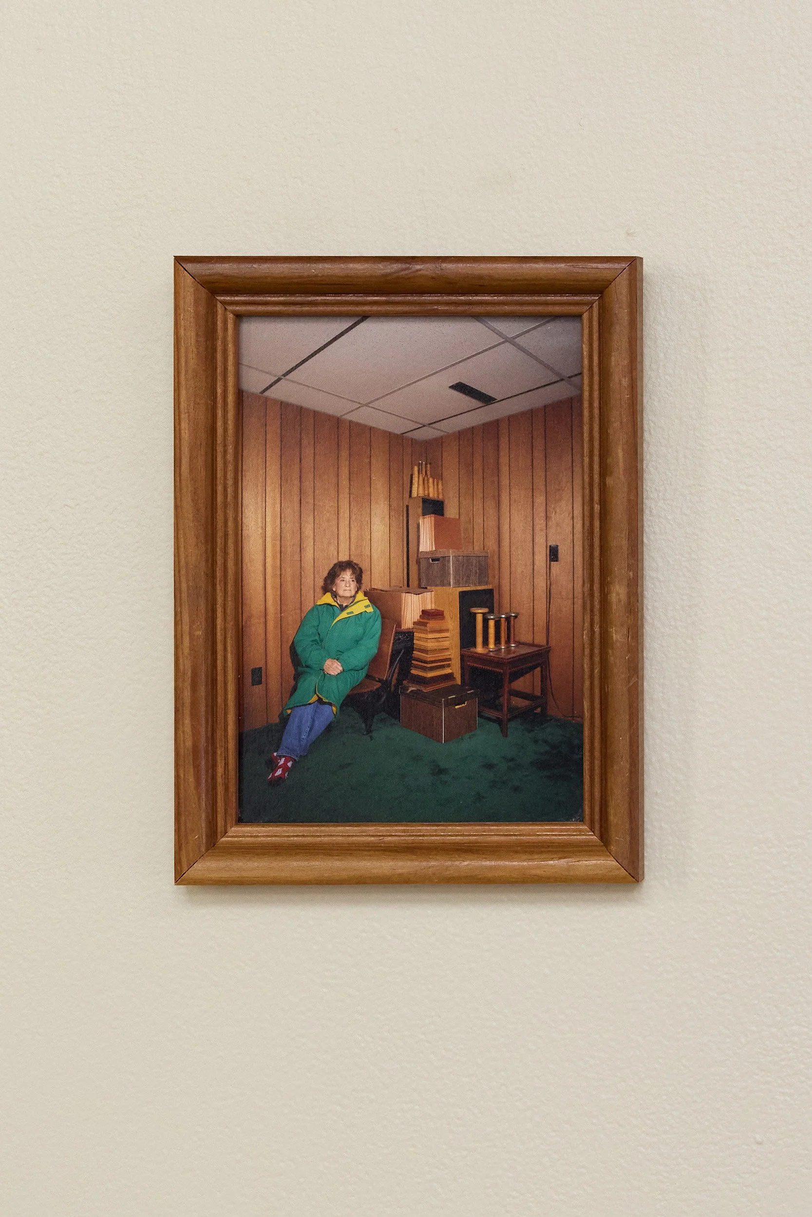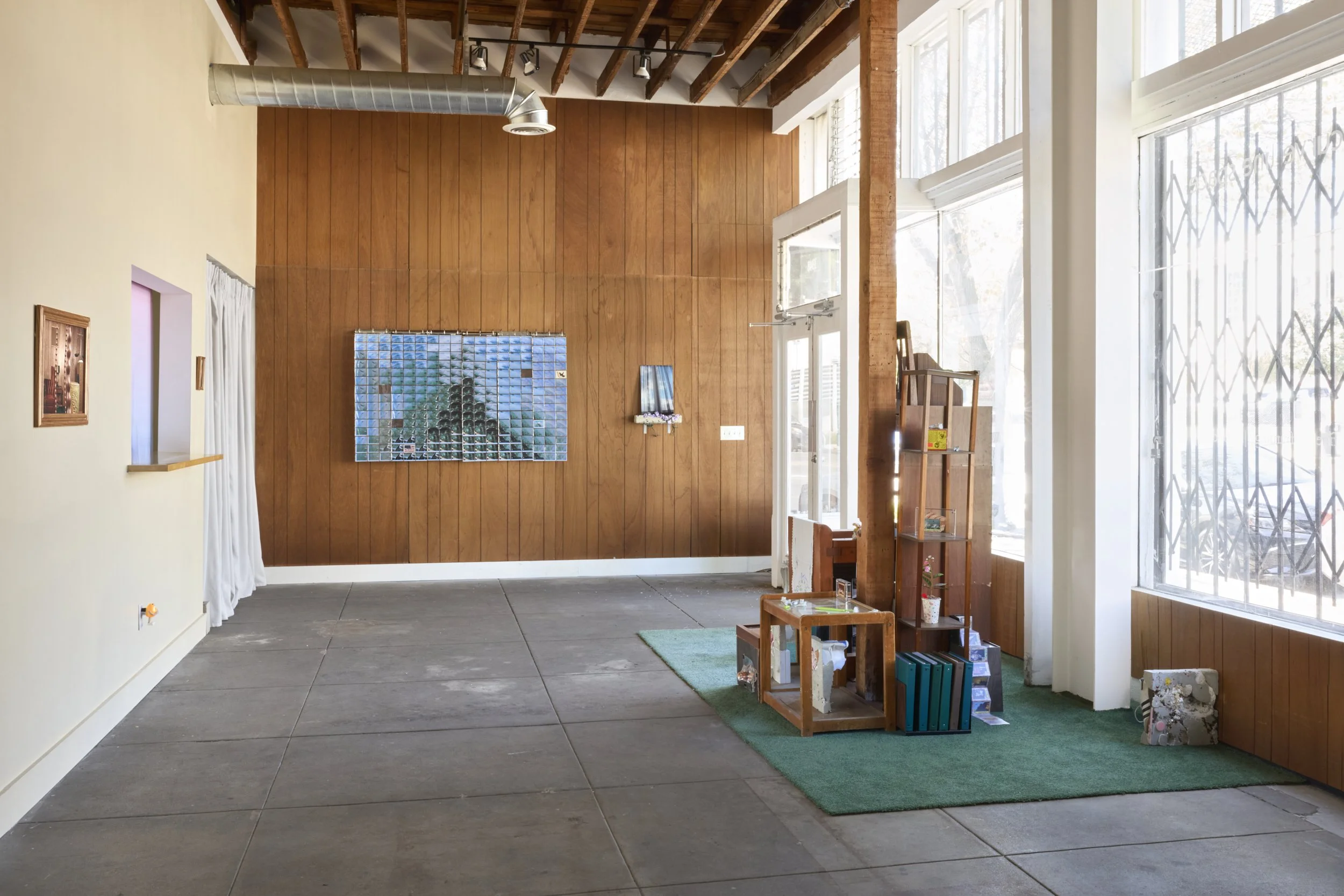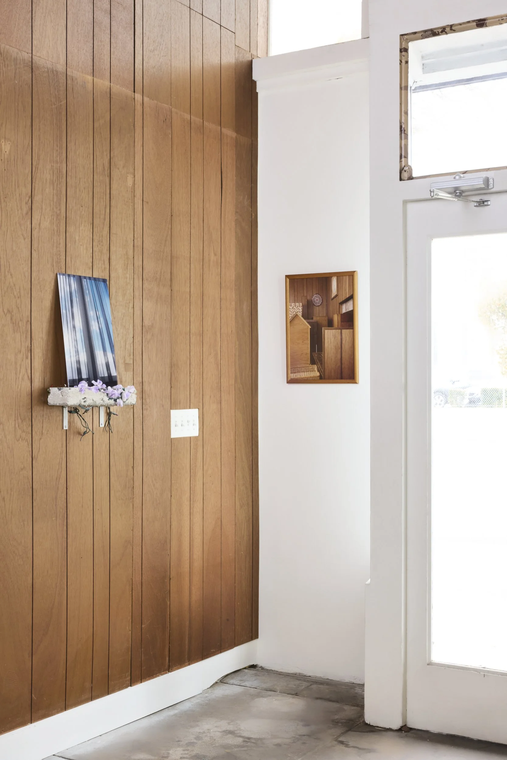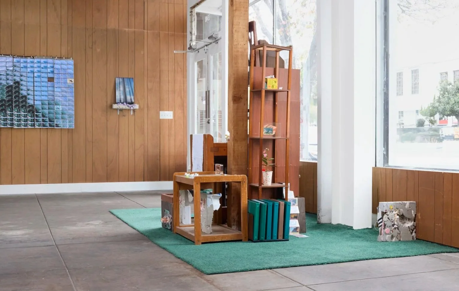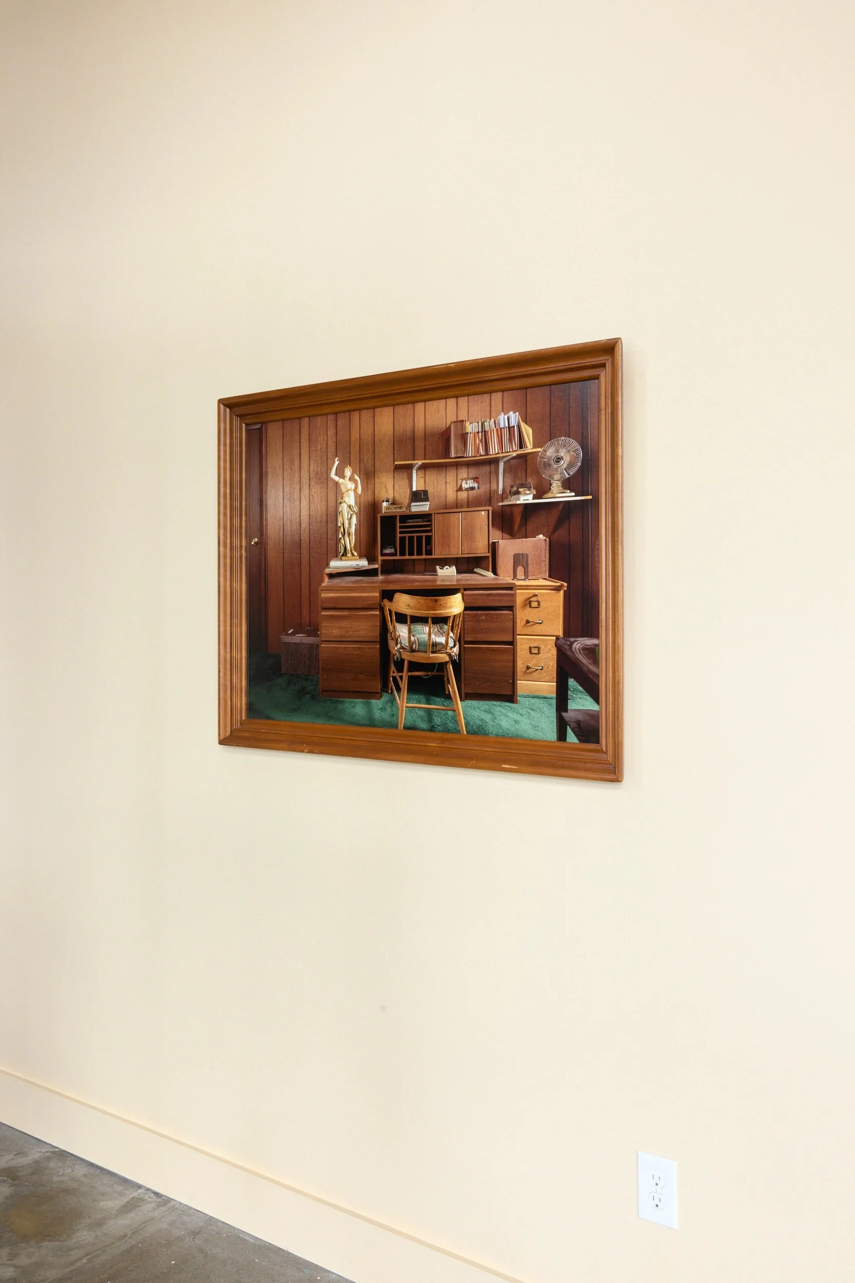The stage is set for inquiry: wood paneling, beige paint, green carpet, clouds and camo. Each motif echoing outward. These materials hold the weight of time and cultural perception. They repeat. They cycle. The works gesture toward archives that are in flux, that mutate with each new layer of meaning we impose. With each roadtrip we take. With every sojourn back home.