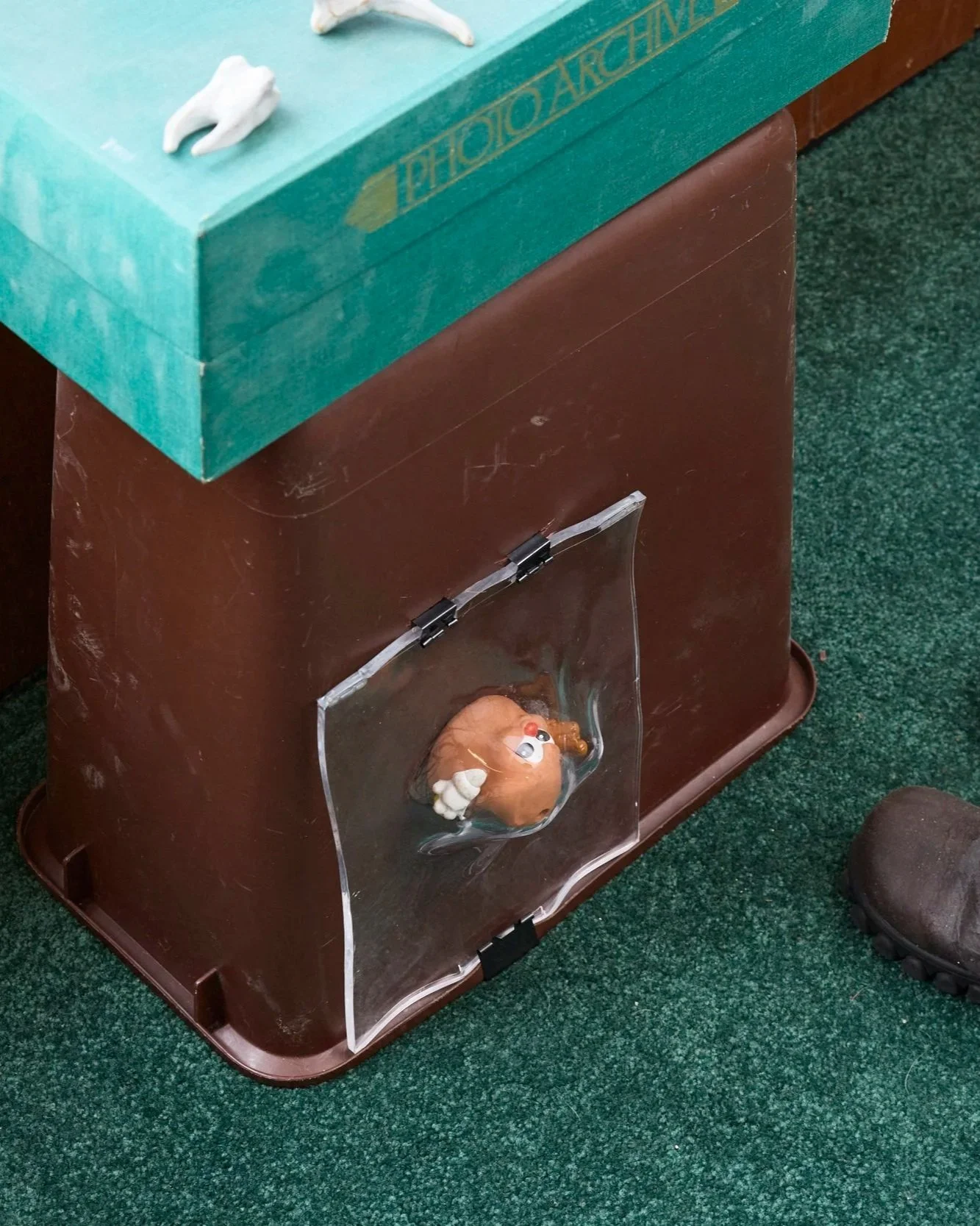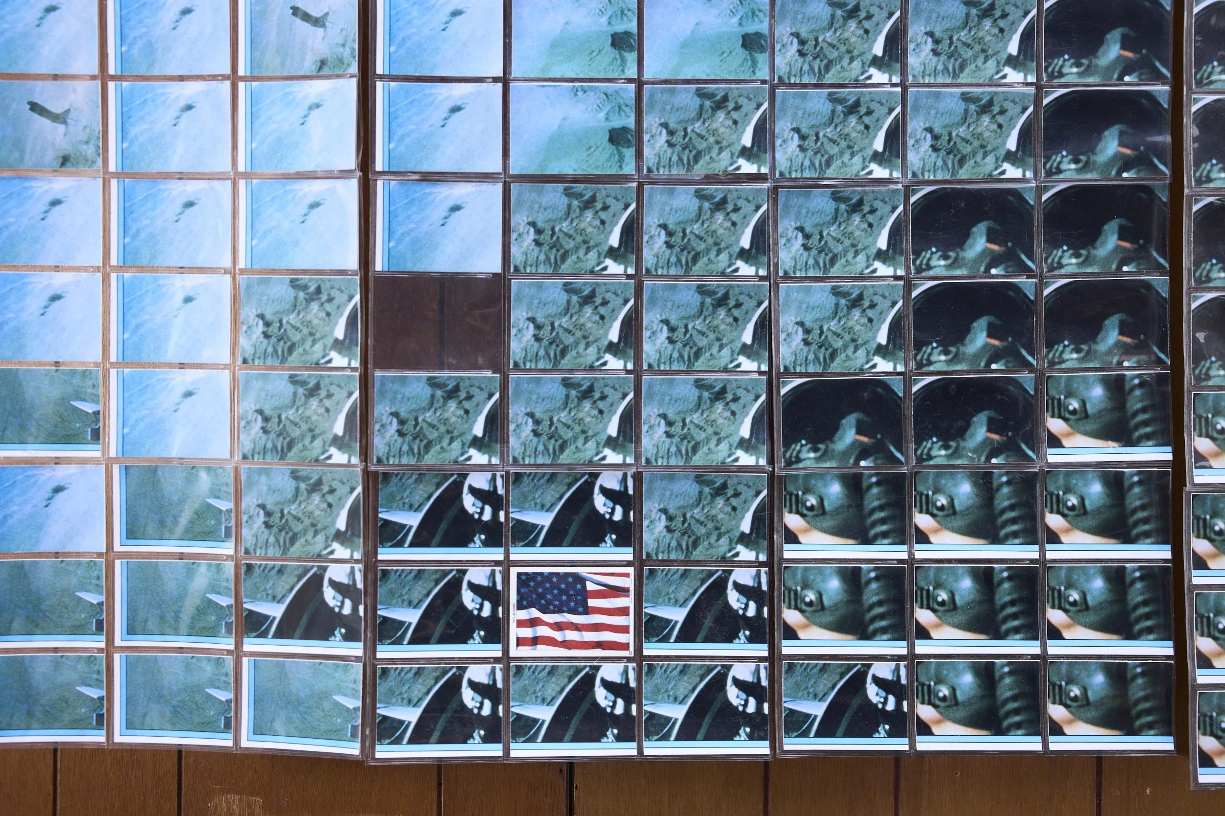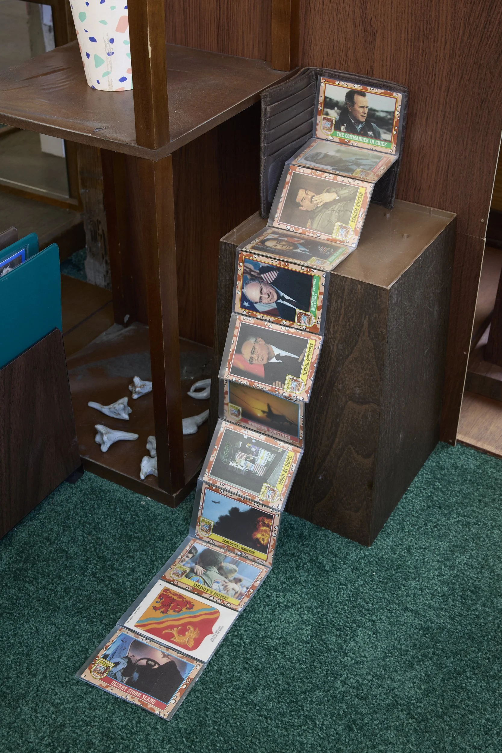 Simultaneously, Brown brings us into a basement in the Midwest – a space both archival and subconscious, where personal memory and broader cultural histories are stored and played. The photographs: too staged to be candid, too real to be artificial. The objects: fast-food toys, war trading cards, wood veneer, binder clips—detritus from a childhood in the 1990s, assembled and reassembled, entangled in an archive of a catalog that has been tampered with and manipulated. But archives are never neutral. Brown’s altered objects play with a drive to hold nostalgia close, teasing out its contradictions, and revealing how consumer culture flattens memory into collectible form. His work questions shared memory by cutting away, layering, and repeating wartime adolescent trading cards—using strategies of repetition to frame their propagandic nature. A fighter jet cockpit, suffused in high-altitude skylight, shifts from artifact to abstraction. Fragments scatter, circulate, and take on new forms.